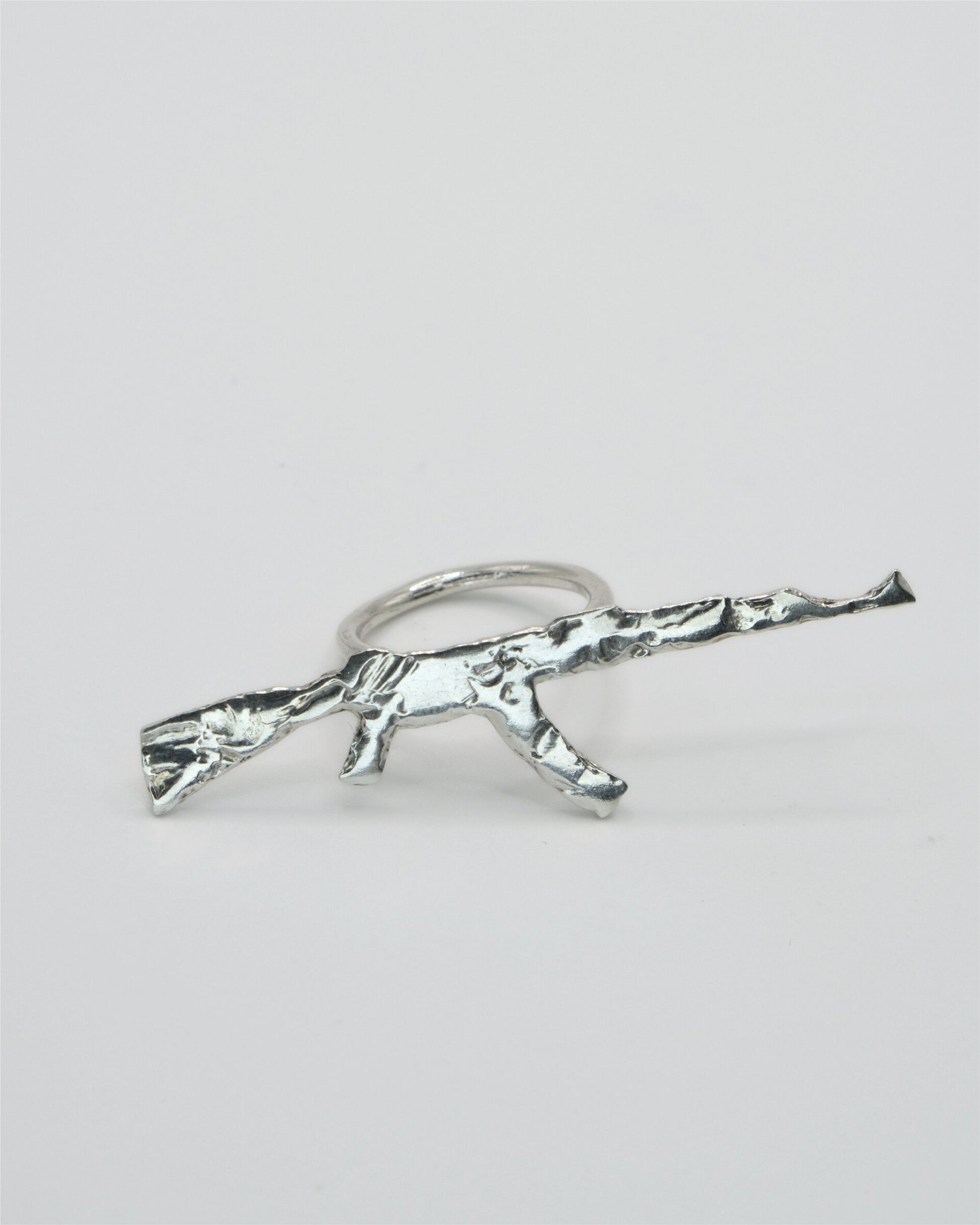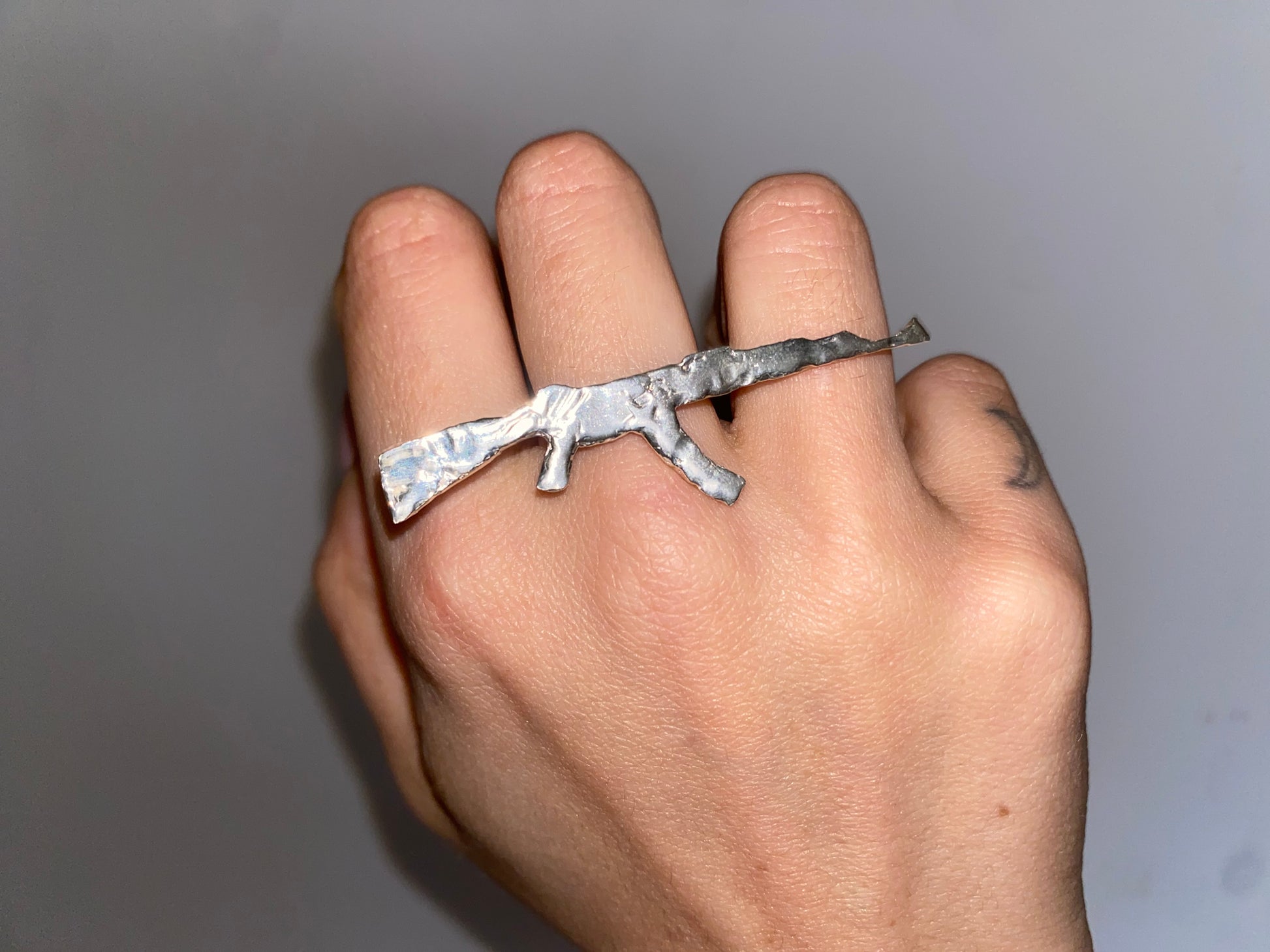 925 sterling silver ring featuring AK47 rifle elongated shape.