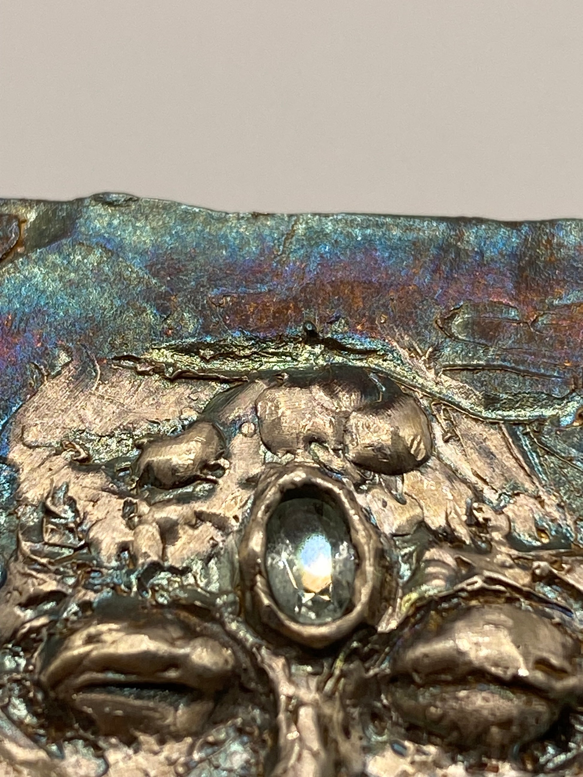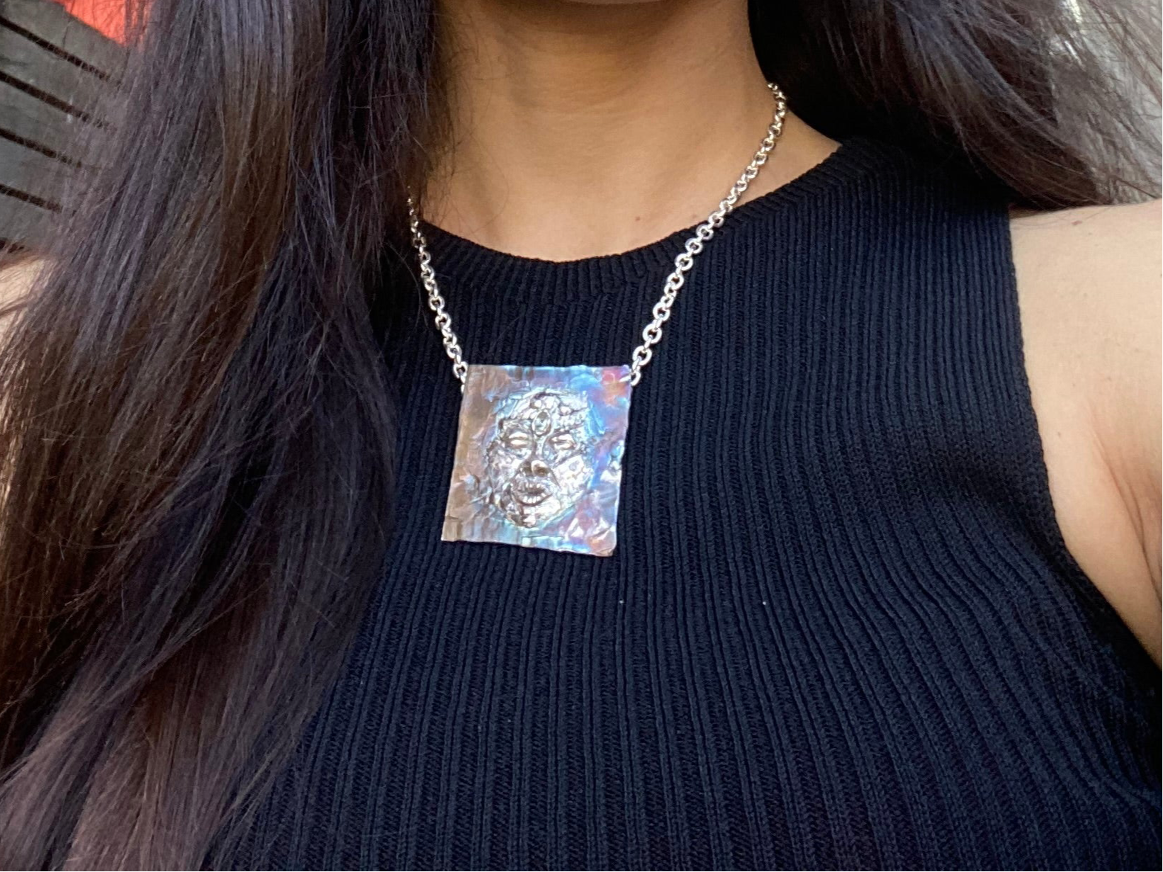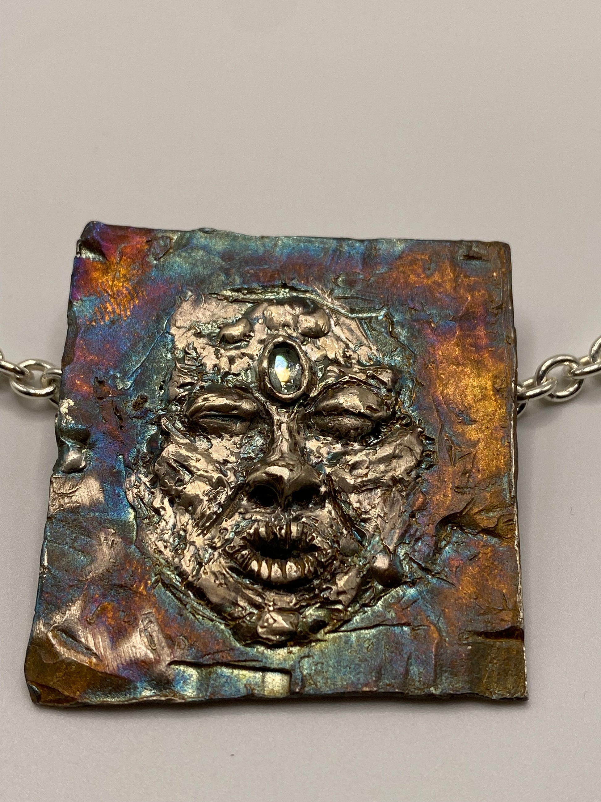 A 925-sterling silver necklace featuring a plate with a woman face embossed on it and a gemstone as third eye - rainbow effect - colorized with patina gel.