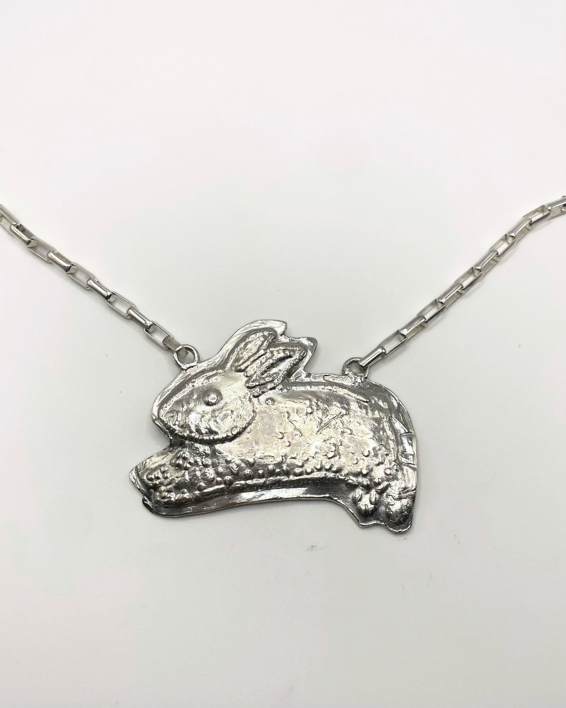 Handcrafted sterling silver necklace featuring a rabbit rendered in embossed detail.