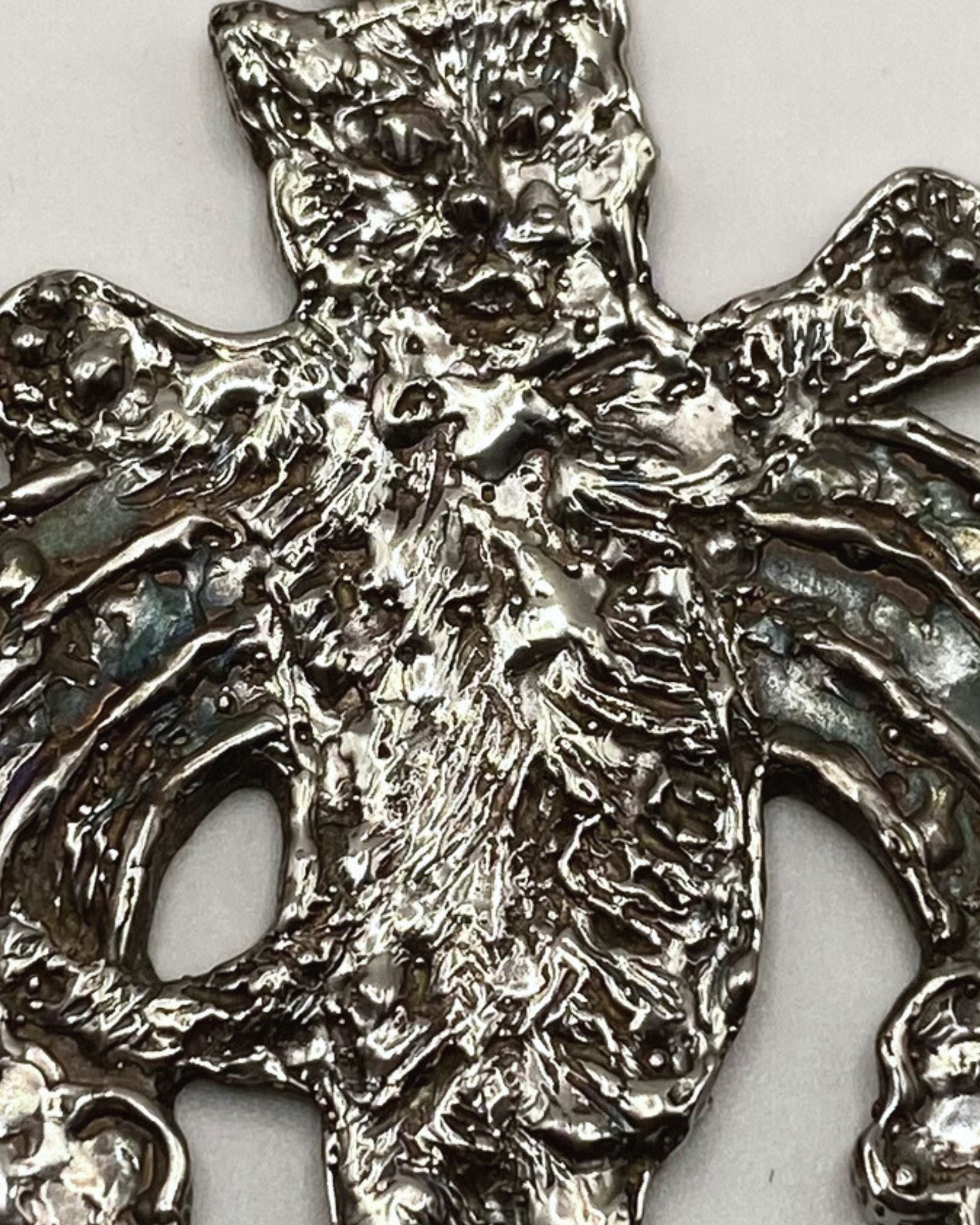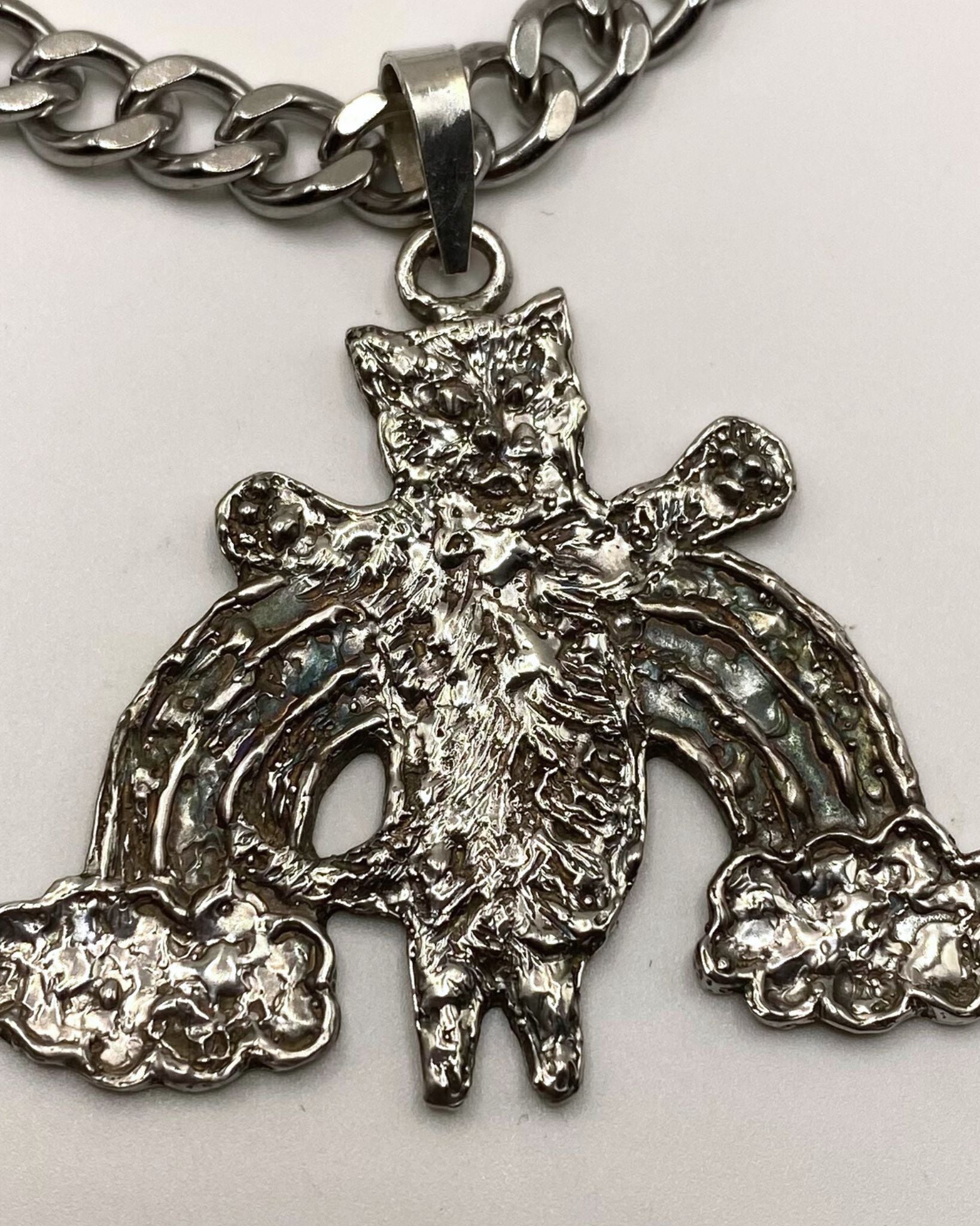 Handcrafted 925 sterling silver pendant featuring a tiny cat with a rainbow arcing behind it.