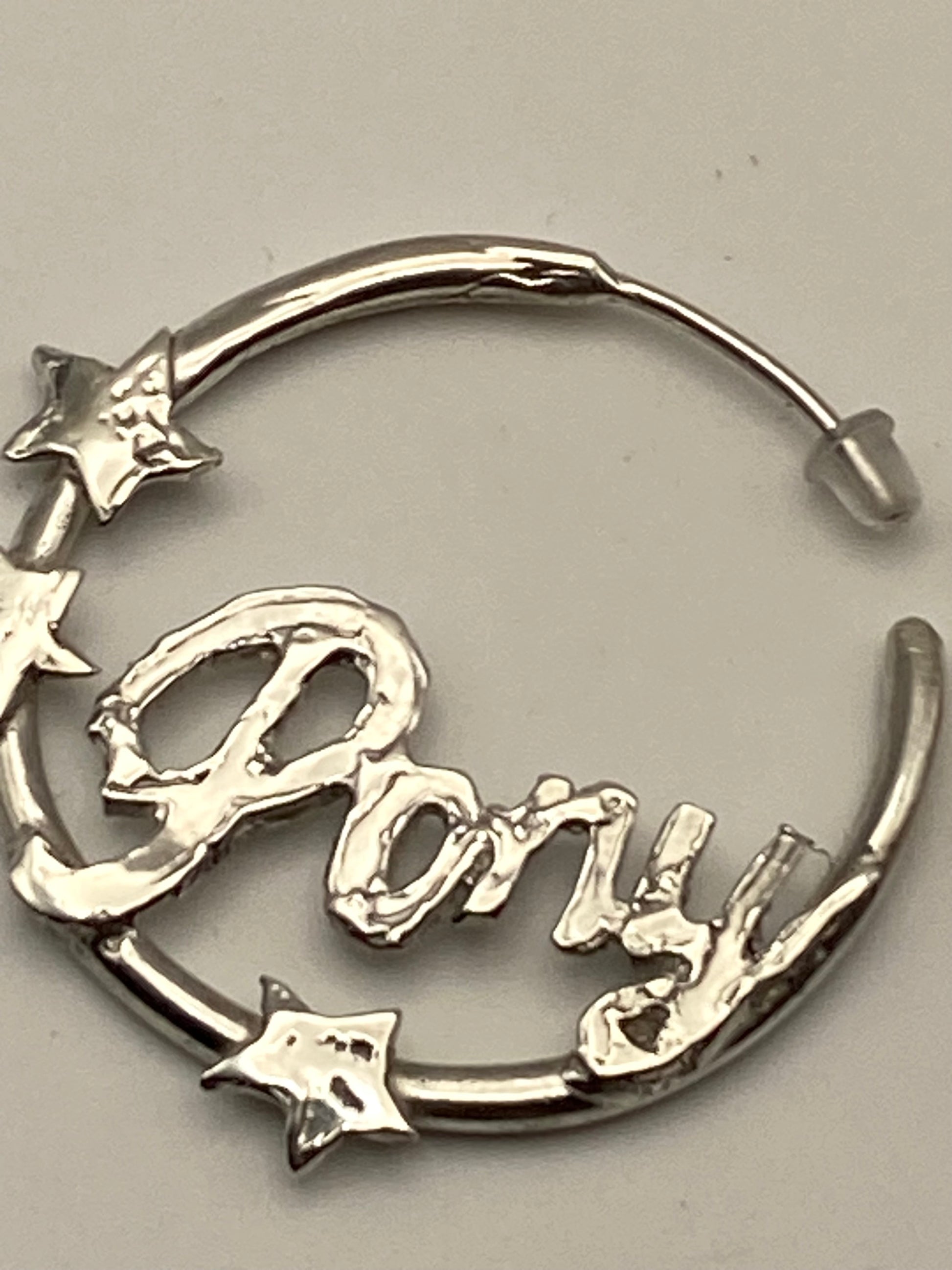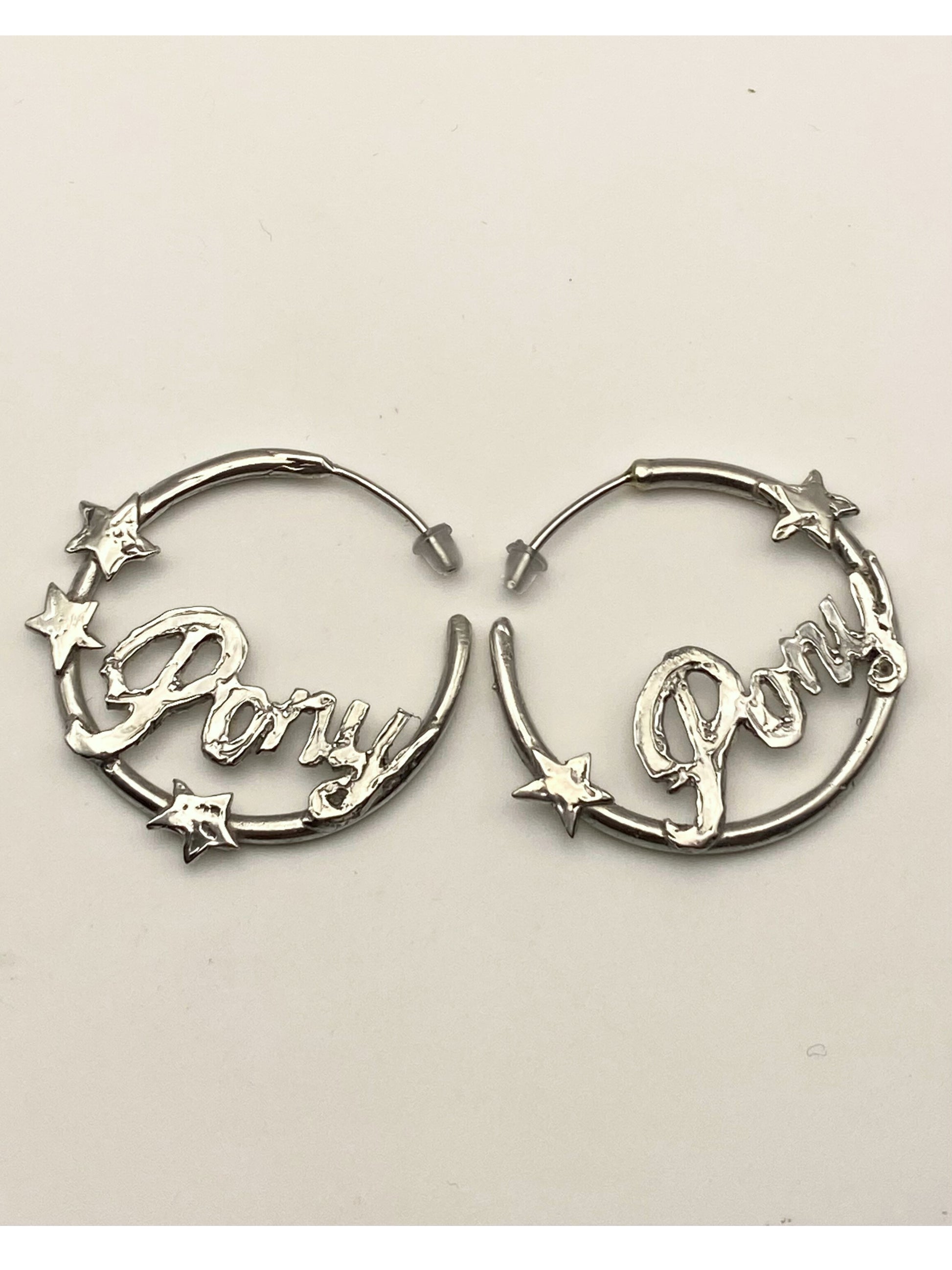 Handcrafted sterling silver hoop earrings featuring the word “Pony” on the hoop, with tiny stars attached along the circular frame. Original NJ design.