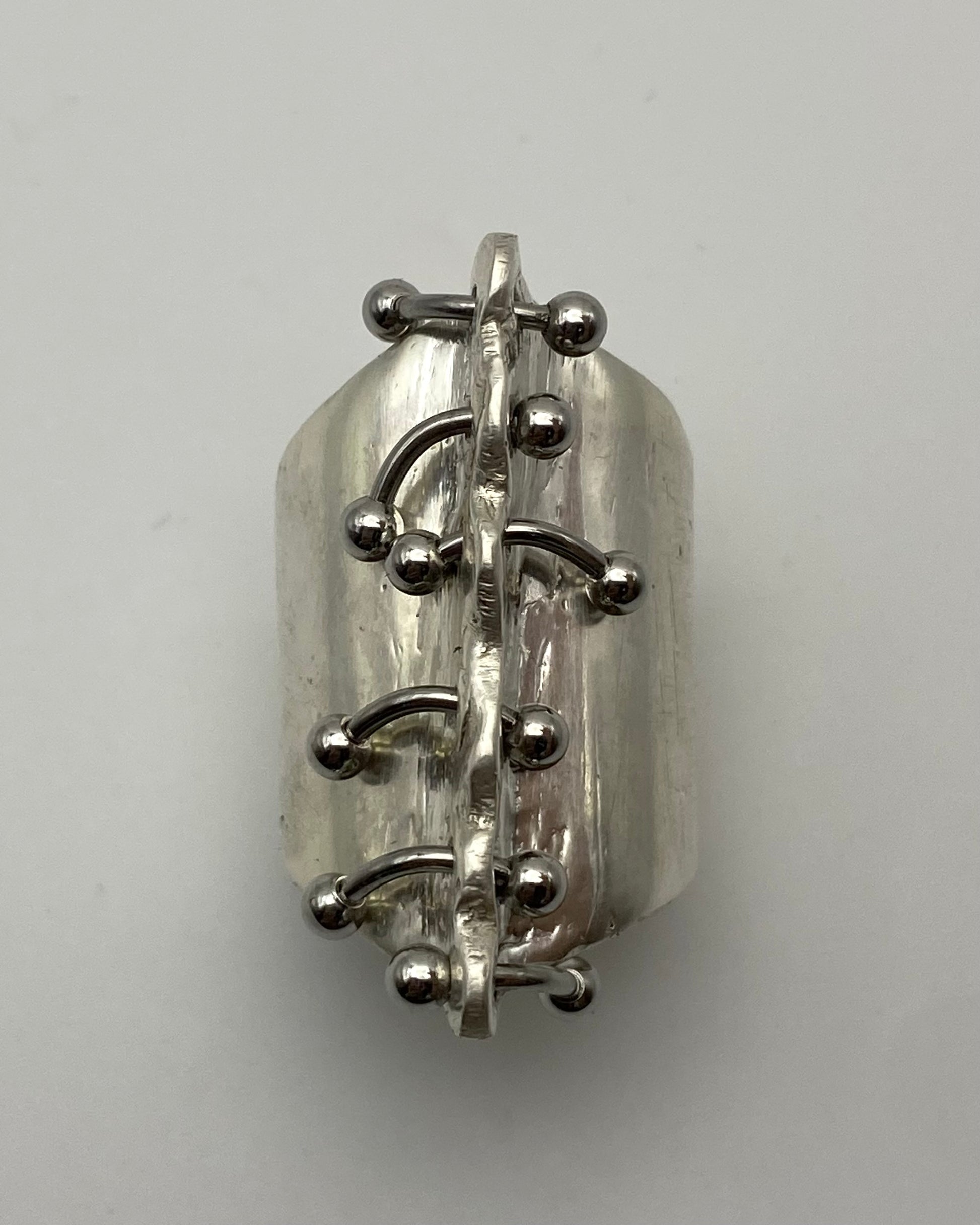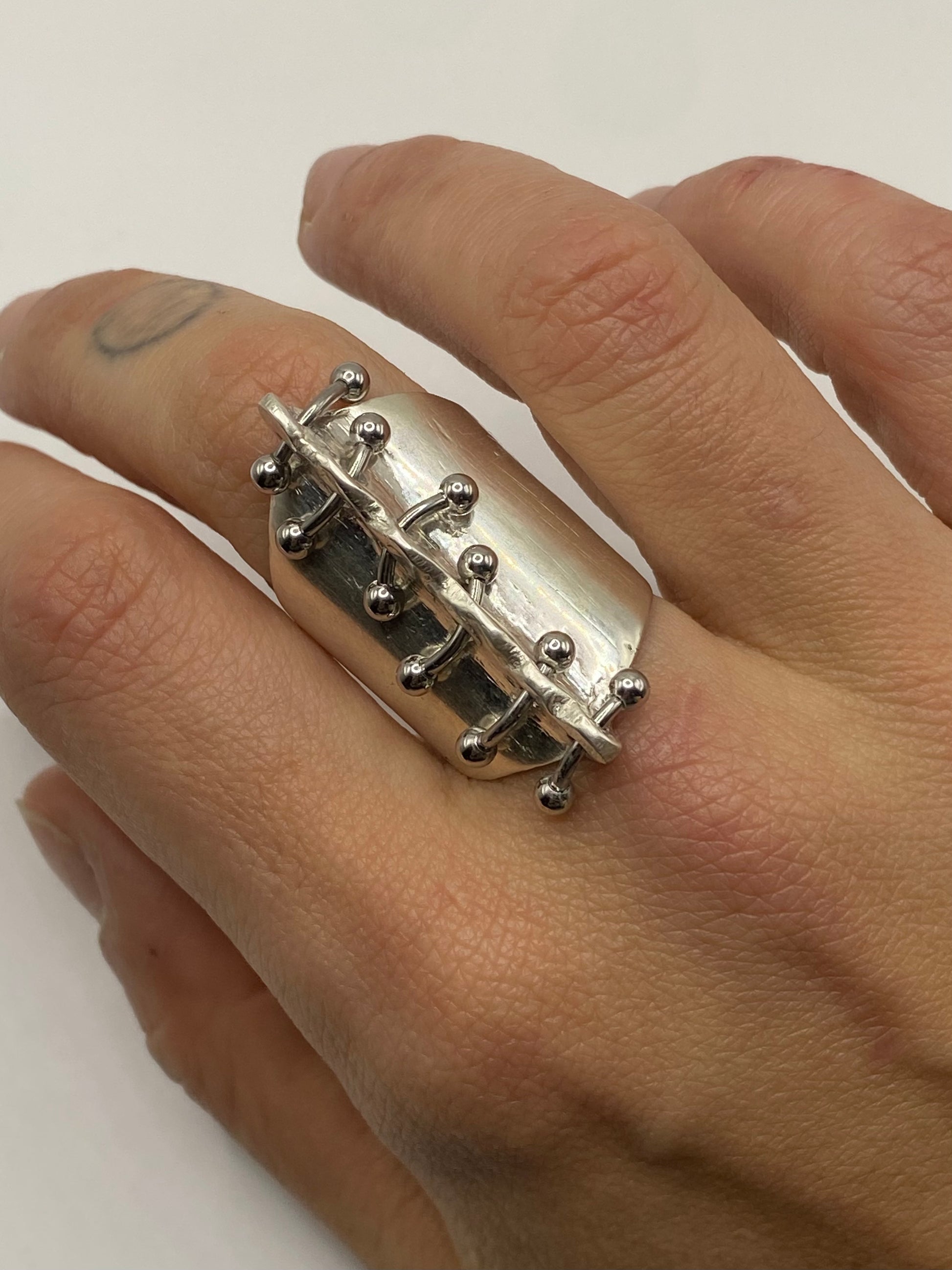 925 sterling silver band ring with a tall front-facing shape that recalls a spine. Set with six 6 mm stainless steel piercings, original NJ design.